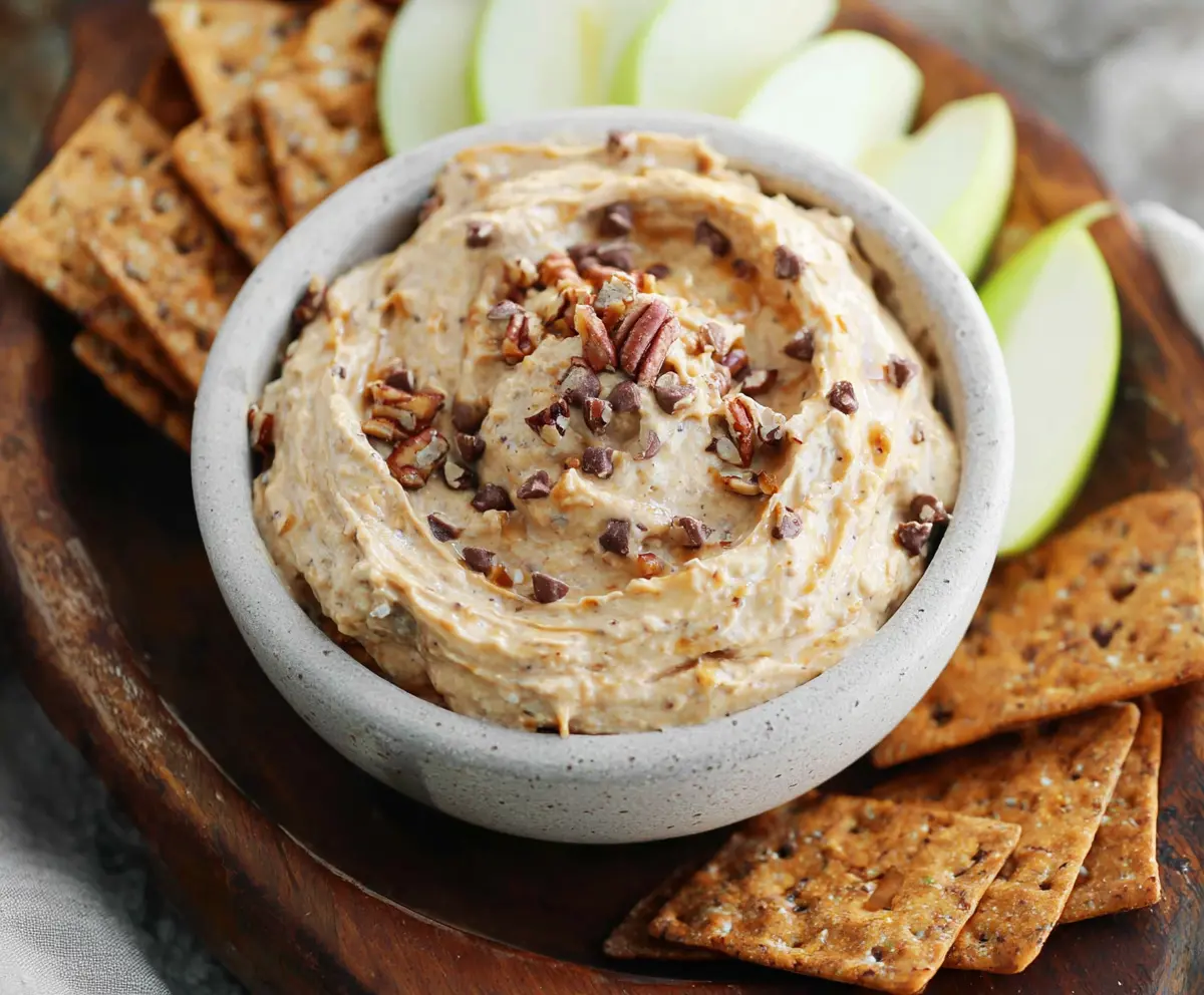 Arrange the sliced apples and optional crackers or pretzels around the dip for the perfect dippers. This allows everyone to enjoy the dip easily!