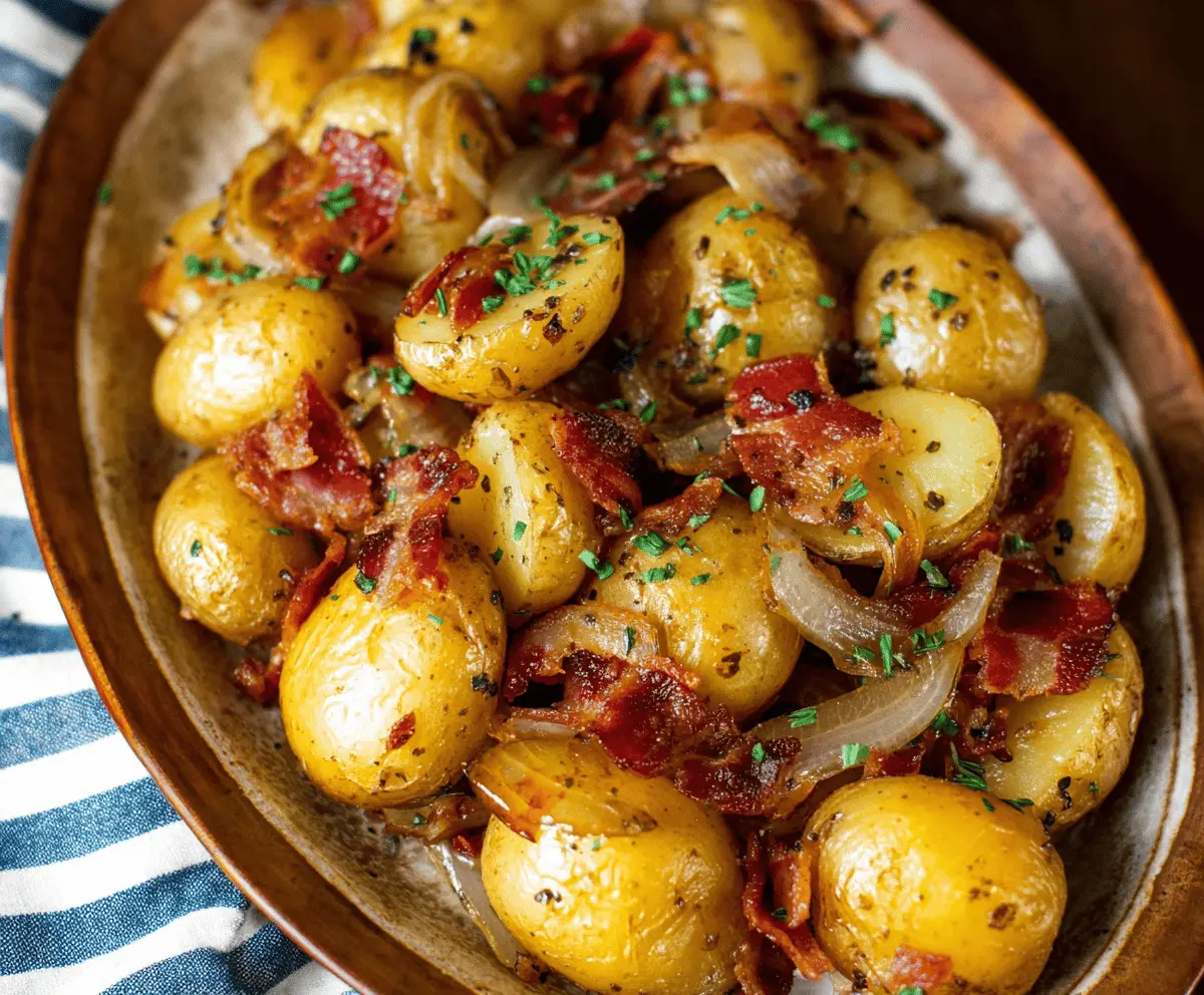Remove the skillet from heat. Before serving, garnish the potatoes with freshly chopped parsley for a pop of color and fresh flavor. Serve warm, and enjoy this delightful combination of baby potatoes, sweet onions, and savory bacon!