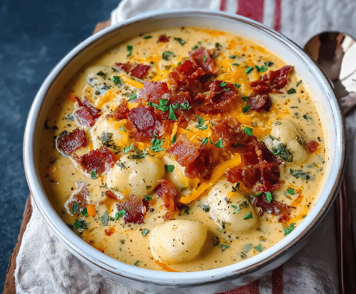 This Bacon Cheddar Gnocchi Soup is warm and cozy! It combines fluffy gnocchi with crispy bacon, sharp cheddar, and creamy goodness to create a delightfully hearty bowl of comfort.