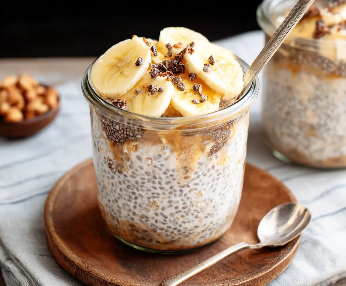 Spoon your delicious overnight oats into a serving jar or bowl. Top them off with sliced banana, granola or chopped nuts for crunch, extra chia seeds, a drizzle of honey or nut butter, and some dark chocolate shavings or cacao nibs if you’re feeling indulgent.