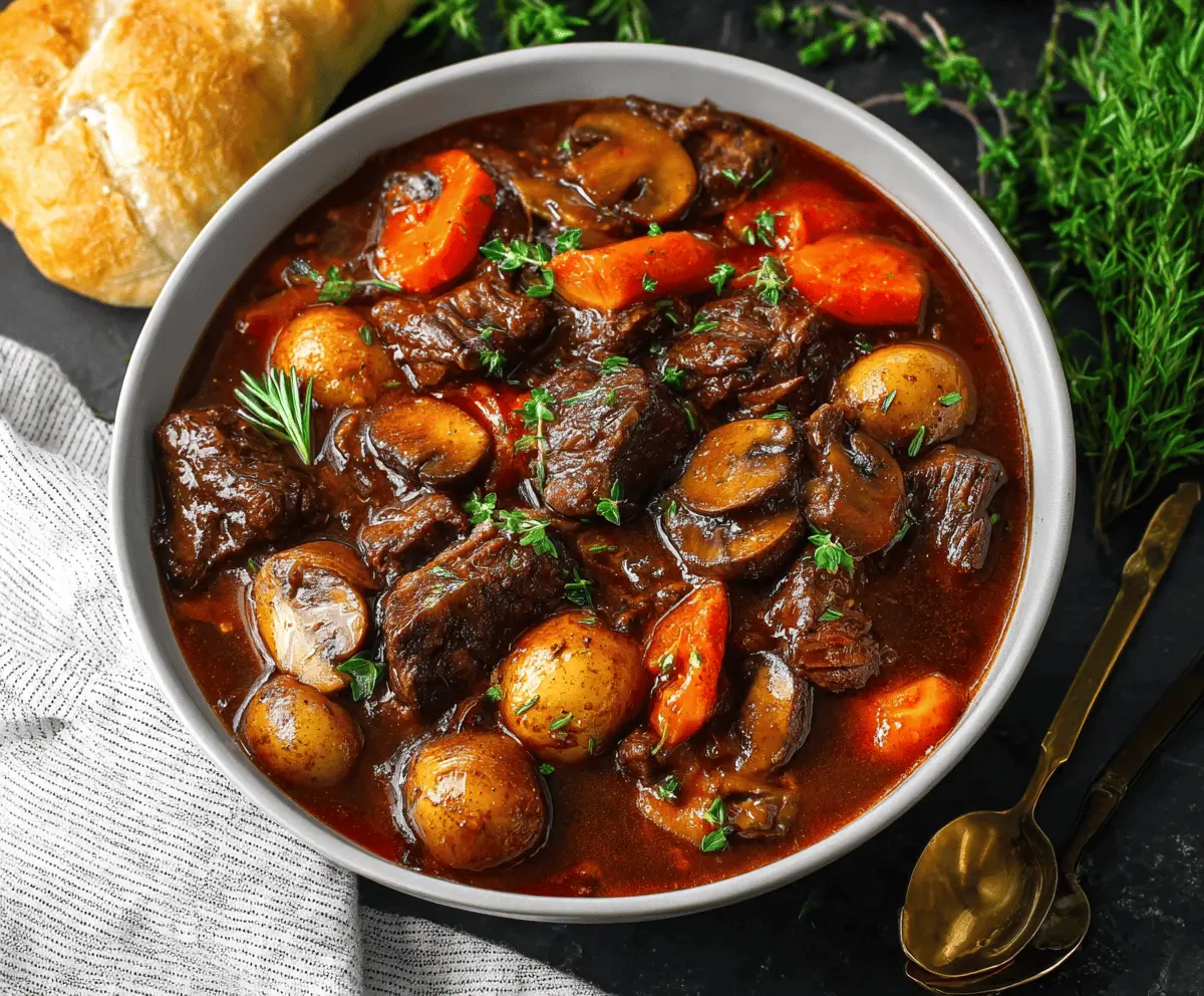 This beef stew is cozy and hearty, packed with tender chunks of beef and yummy mushrooms. It simmers slowly, letting all the delicious flavors mix together.
