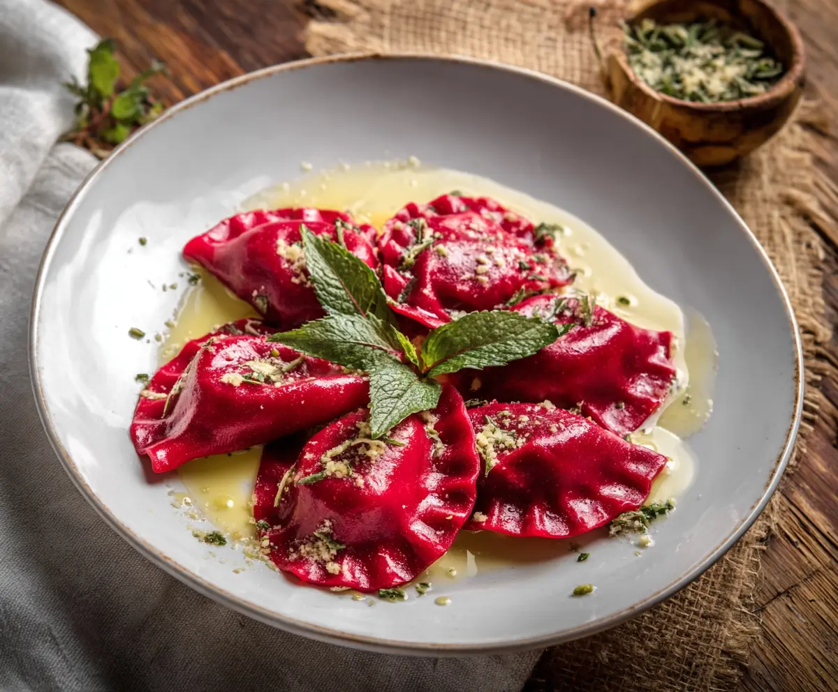 Now dive into your delicious, vibrant beet ravioli! This dish balances the sweetness of beets with the creamy filling and the rich butter sauce, making it a delightful meal for any occasion!