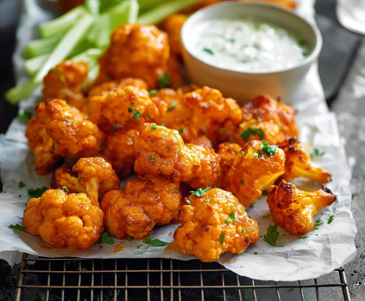 Plate up your crispy, spicy Buffalo Cauliflower Wings and serve hot with your choice of ranch or blue cheese dressing on the side. Enjoy every crunchy bite!