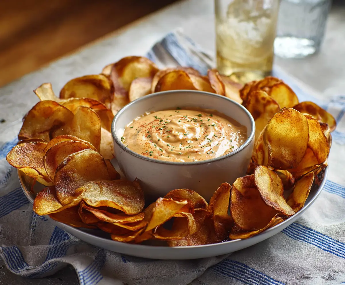 Buffalo chips are crispy potato slices, fried to perfection and served with a spicy Louisiana hot dip. This dish is perfect for game day or any fun gathering!