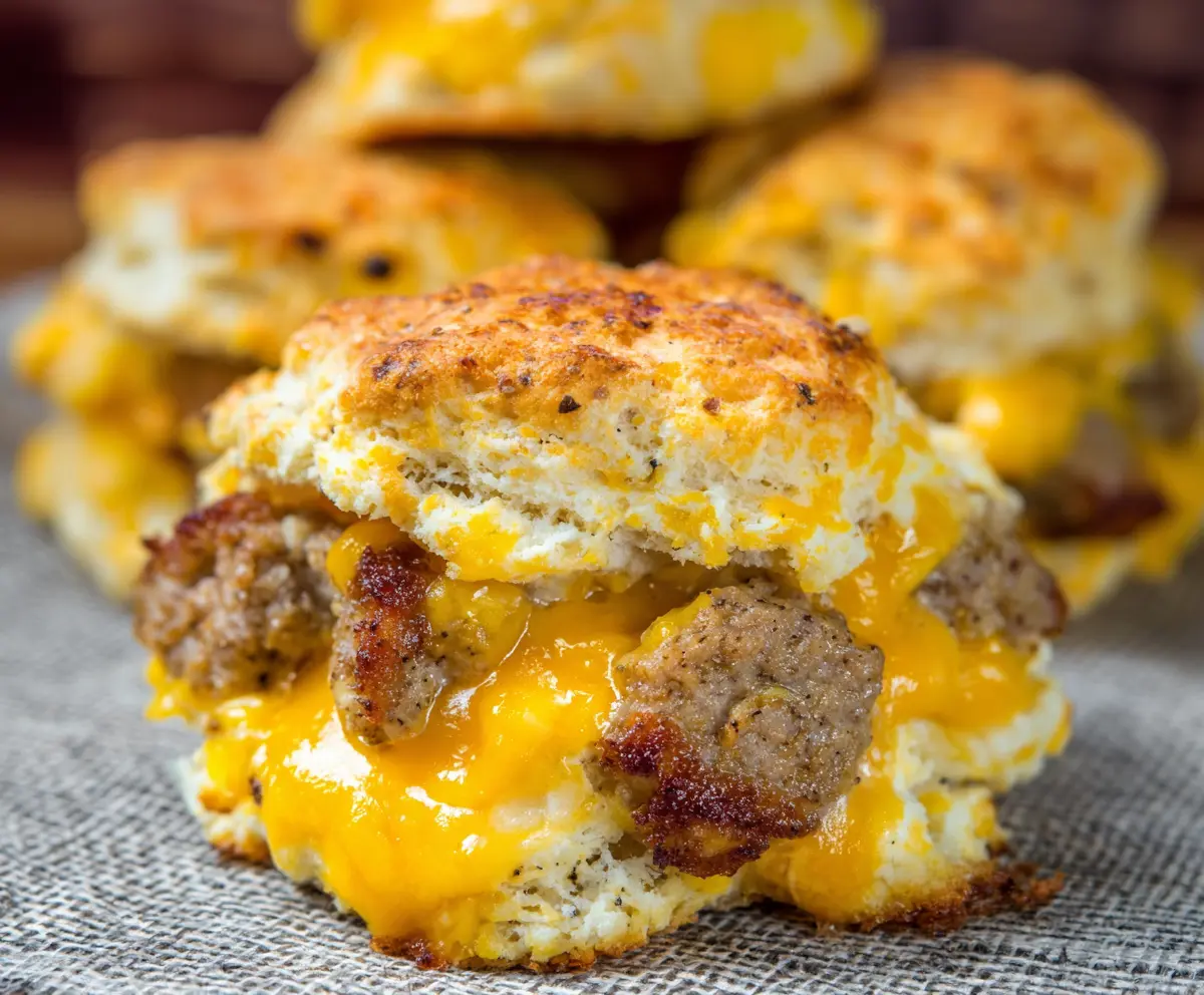 These cheese and sausage biscuits are fluffy little bites of joy! Filled with melty cheese and savory sausage, they make a perfect breakfast or snack.