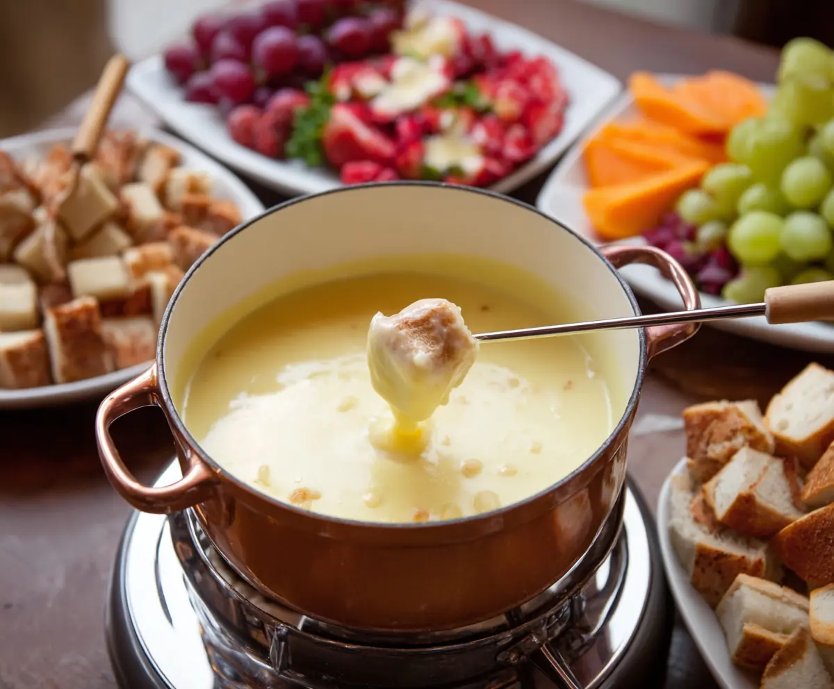 It’s time to dig in! Serve the fondue with cubes of French bread and any assorted dippers you’ve prepared. Grab a fondue fork, spear the bread, and dip it into the gooey cheese—swirl it around to coat every delicious bite!