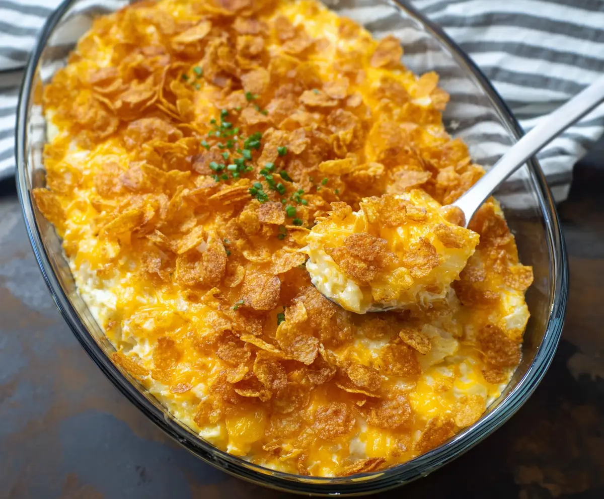 This dish combines creamy cheesy potatoes with a crunchy, buttery corn flakes topping for a comforting and tasty casserole. Enjoy!