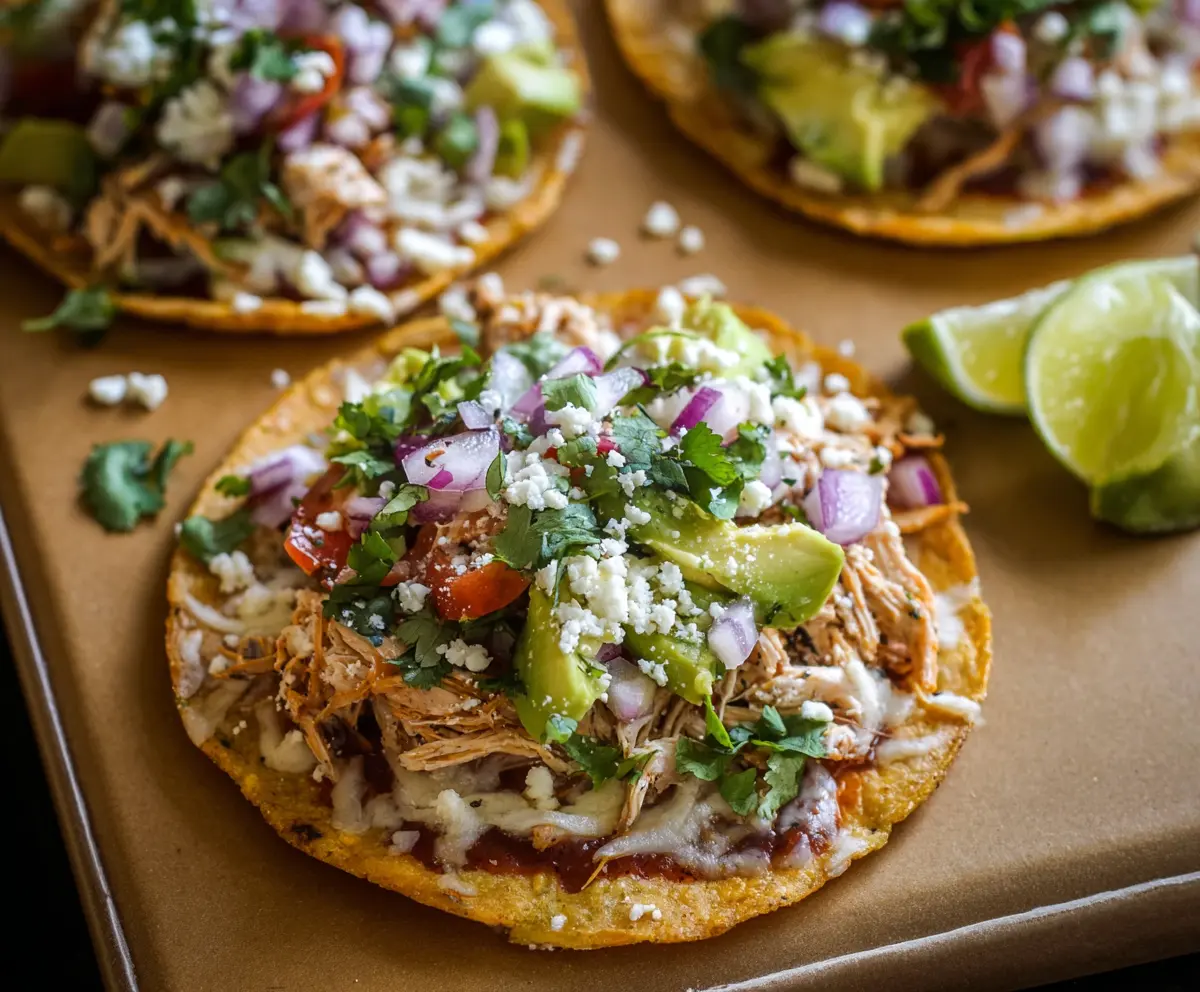 Chicken tostadas are crunchy tortillas topped with delicious shredded chicken, fresh veggies, and zesty salsa. They’re perfect for a fun meal with family or friends!