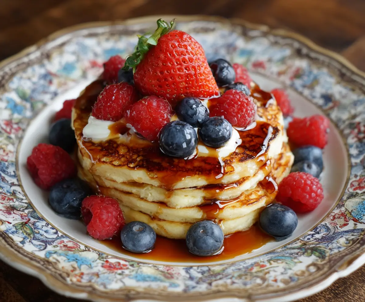 Stack your pancakes on a lovely plate and top them with fresh blueberries, raspberries, and perhaps a mint leaf for a touch of color. For a little extra sweetness, feel free to drizzle some honey or maple syrup on top.