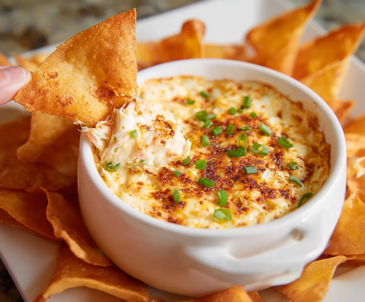 Now it’s time to bake the dip! Place the dish in the preheated oven and bake for about 20-25 minutes, or until the top is bubbly and golden brown. Once it’s out of the oven, garnish with some extra sliced green onions for a fresh touch. Serve it warm alongside your crispy wonton chips for dipping. Enjoy every creamy, cheesy bite of this delicious Crab Rangoon Dip with the perfect crunchy chips!