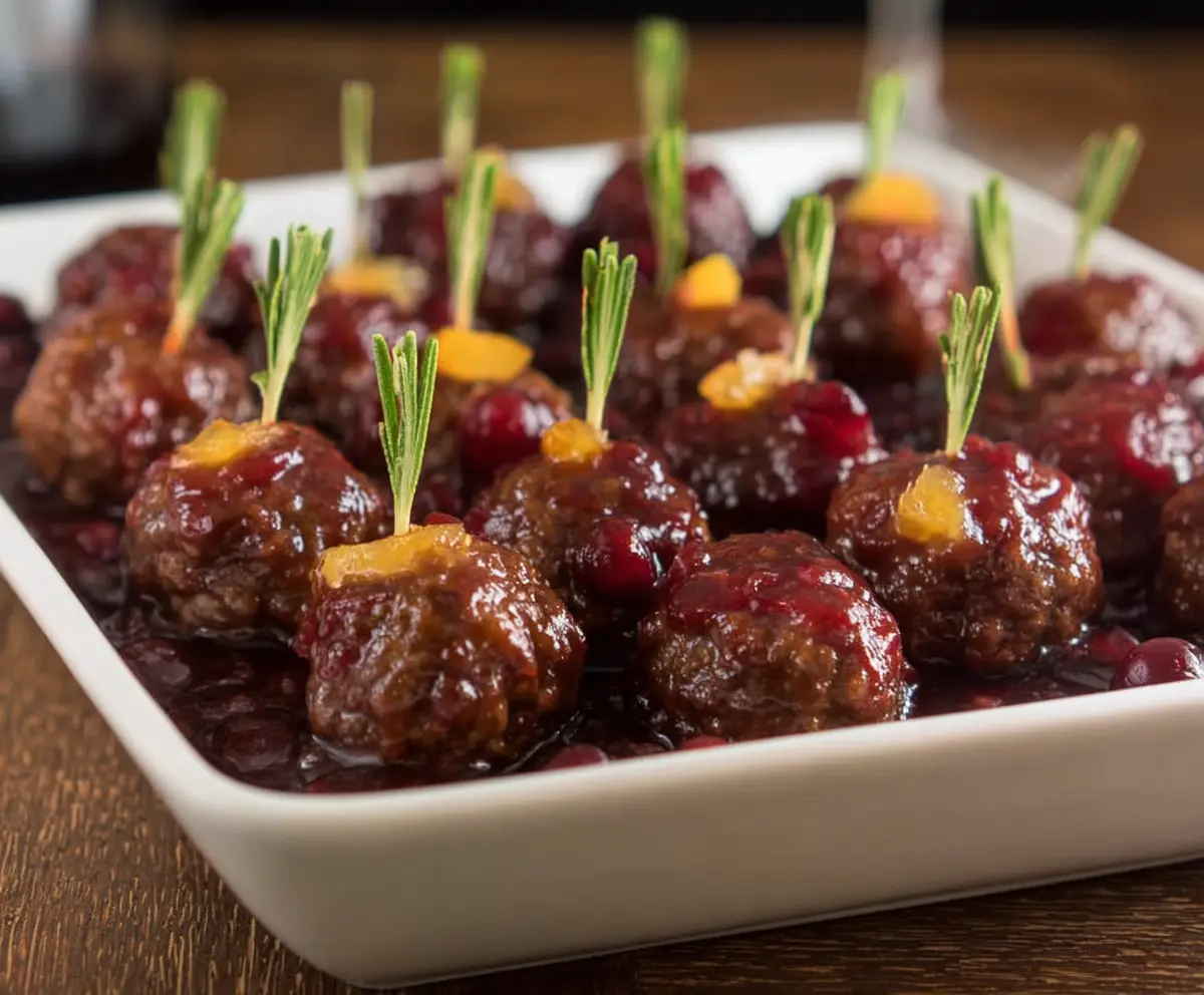 Transfer the sauced meatballs to a serving dish. For a festive touch, insert a small cocktail stick into each meatball and top with a fresh cranberry. If you’d like, you can also add a sprig of rosemary in the center—they look beautiful!