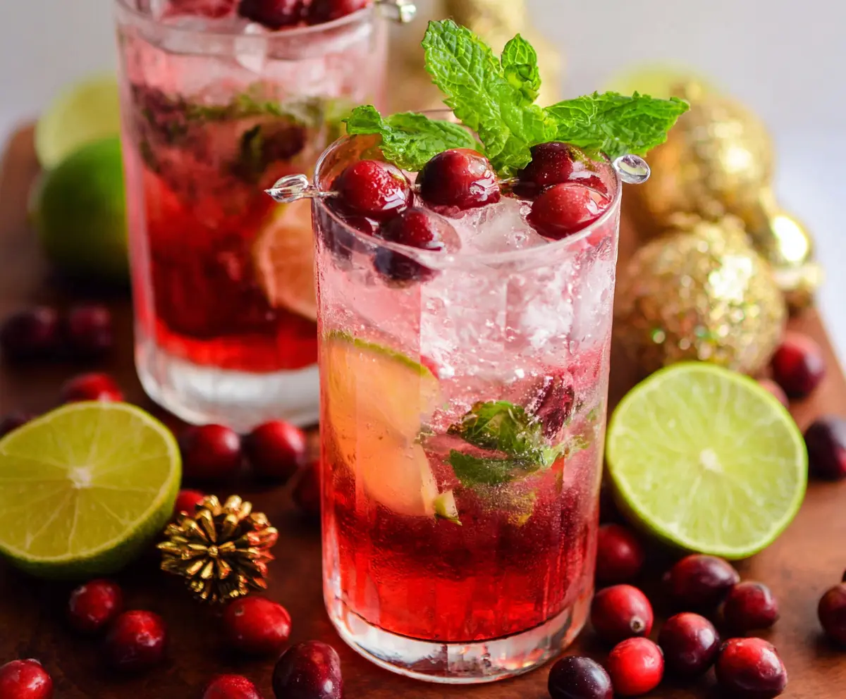 For the finishing touch, add a sprig of fresh mint, a slice of lime, and a skewer of fresh cranberries as a garnish. Now you’re ready to serve your stunning drink!