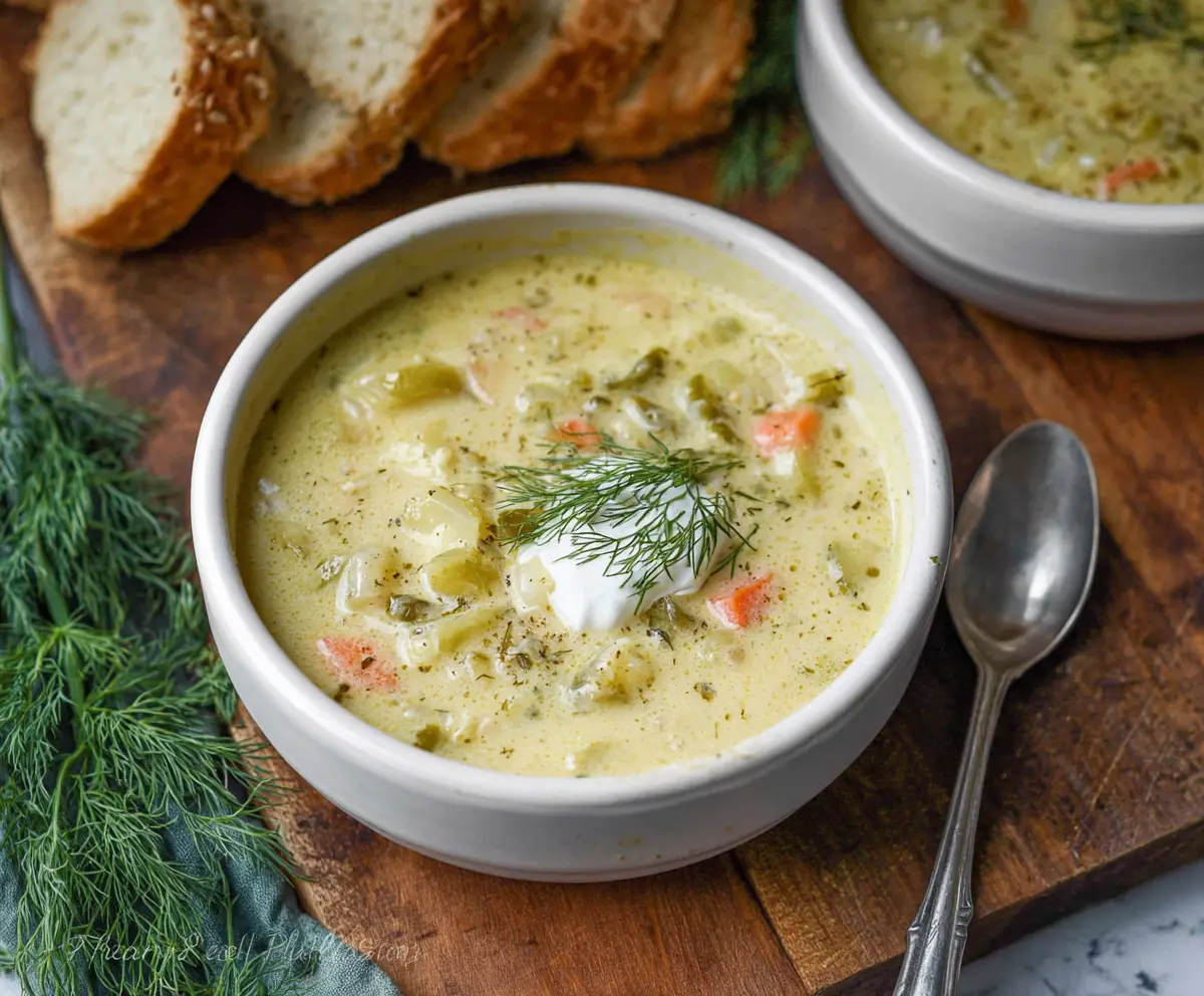 Serve your creamy dill pickle soup hot, garnished with fresh dill sprigs and a small dollop of sour cream on top if you’d like. It’s perfect for a cozy meal!