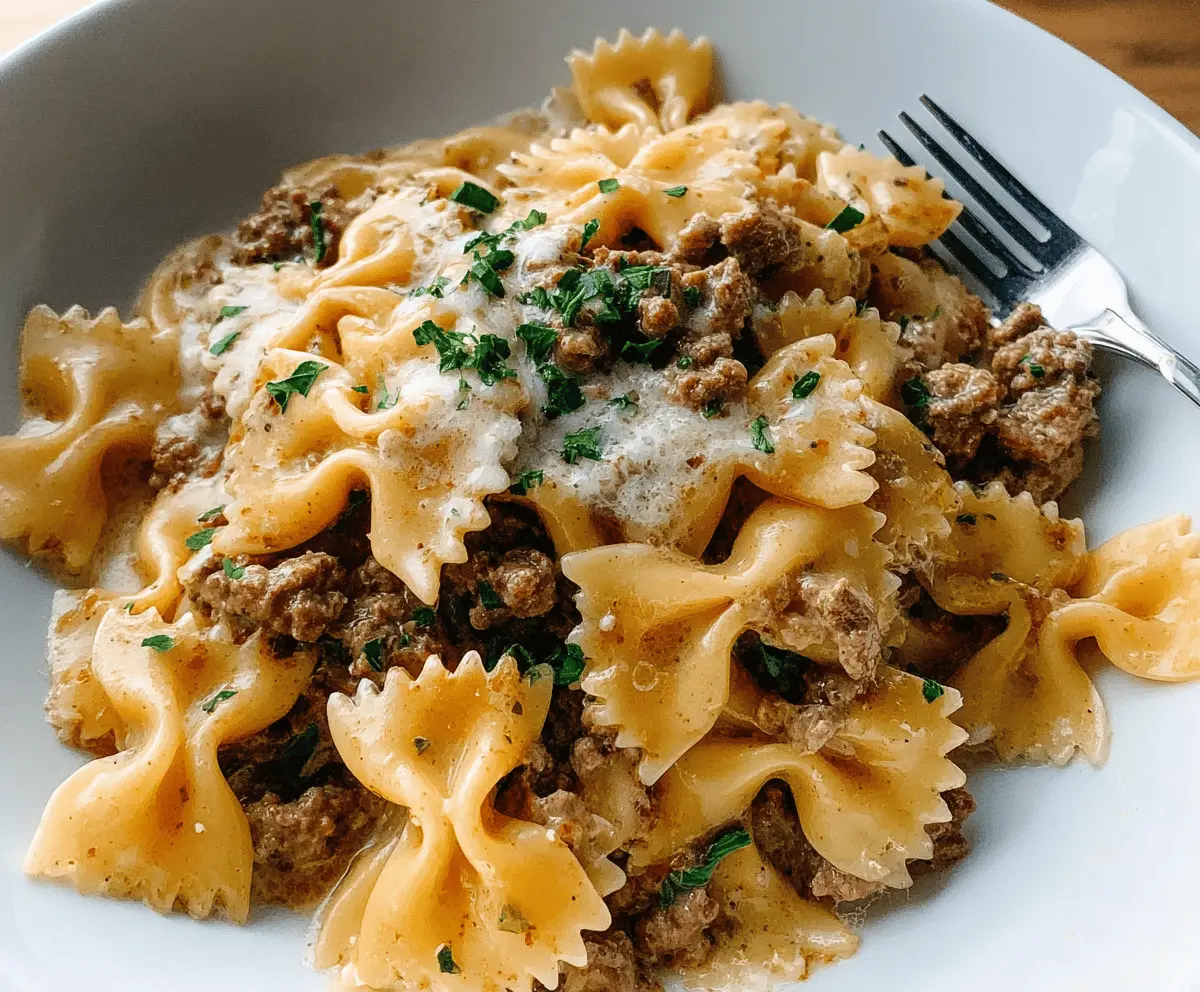 Return the cooked ground beef to the skillet and mix it with the creamy sauce. Then add the drained bowtie pasta to the skillet, tossing everything together until the pasta is well coated in the creamy beef sauce.