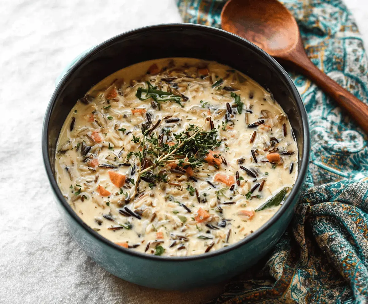 Serve the soup hot, garnished with fresh parsley or thyme if you’d like. Enjoy the warmth and comfort of your creamy wild rice soup!