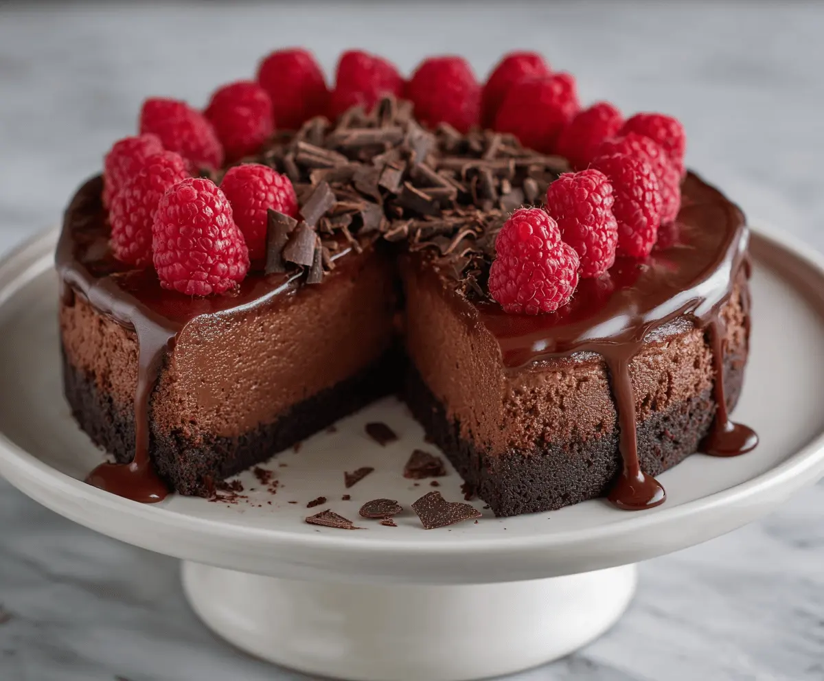 Chill the assembled cheesecake for another 30 minutes to let it set a bit more. When you’re ready to serve, slice it up and enjoy the amazing combination of rich dark chocolate and fruity raspberries!