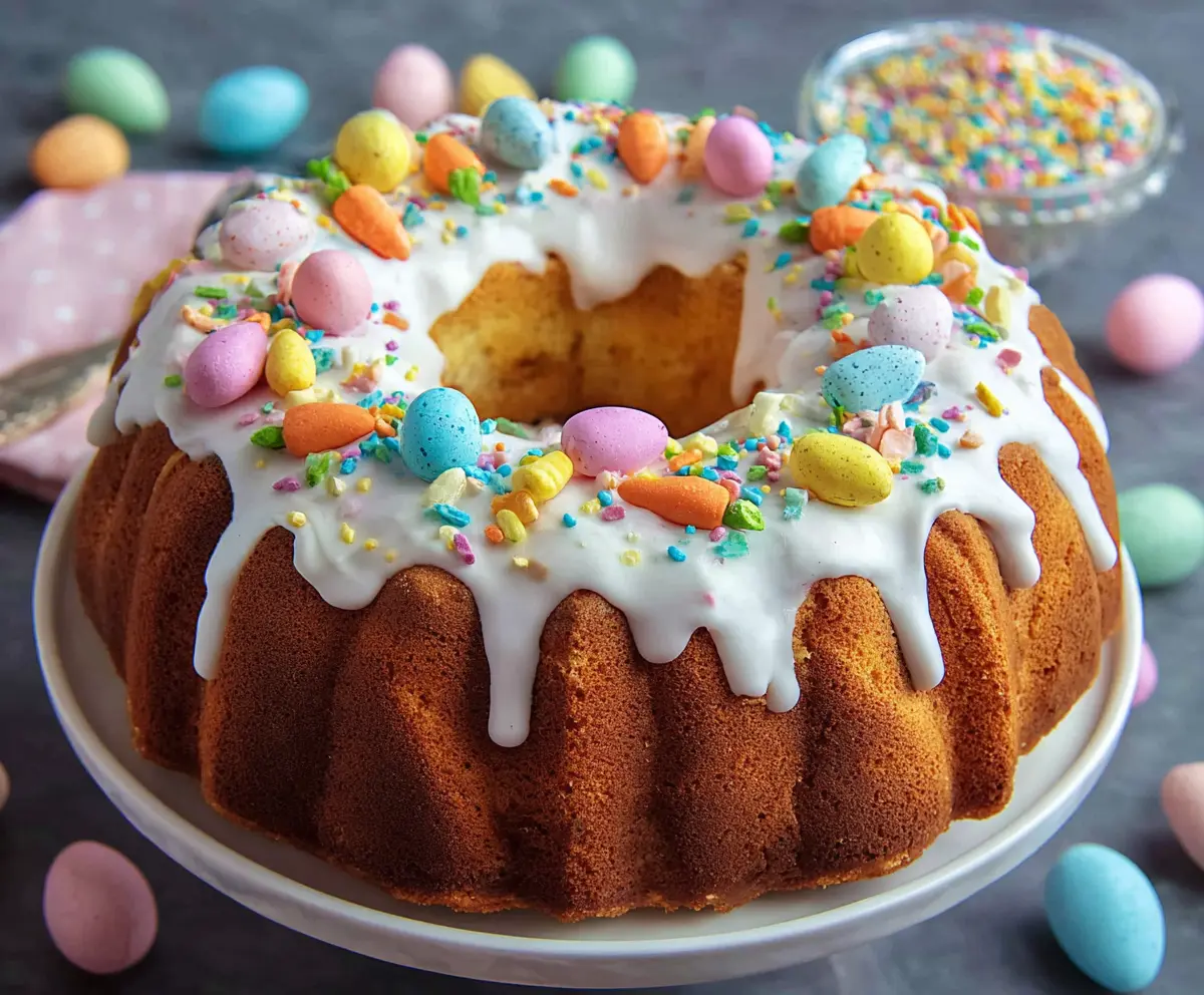 This Easter Bundt Cake is a cheerful treat, full of bright colors and flavors. It has a soft, moist texture and is often topped with sweet glaze— perfect for celebrating spring!
