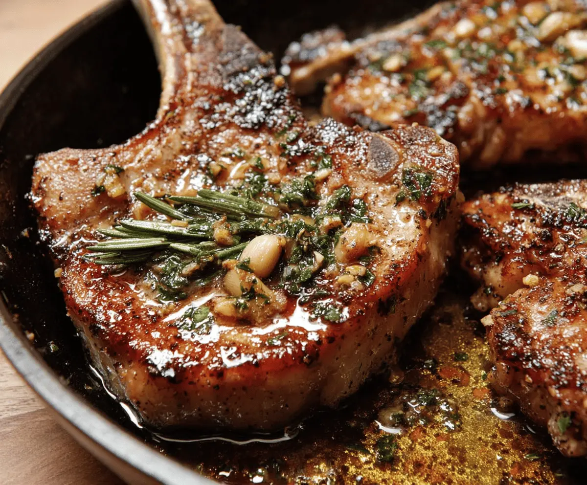 This method produces juicy, tender pork chops topped with a rich garlic herb butter that complements the meat perfectly. Enjoy your meal!