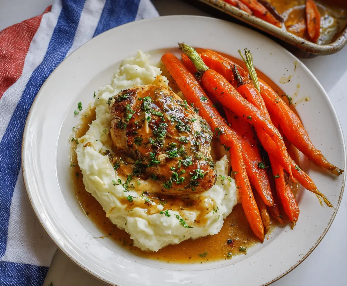 This Garlic Herb Chicken is juicy and bursting with flavor, served alongside creamy mashed potatoes and sweet glazed carrots. A comforting meal that warms the heart!