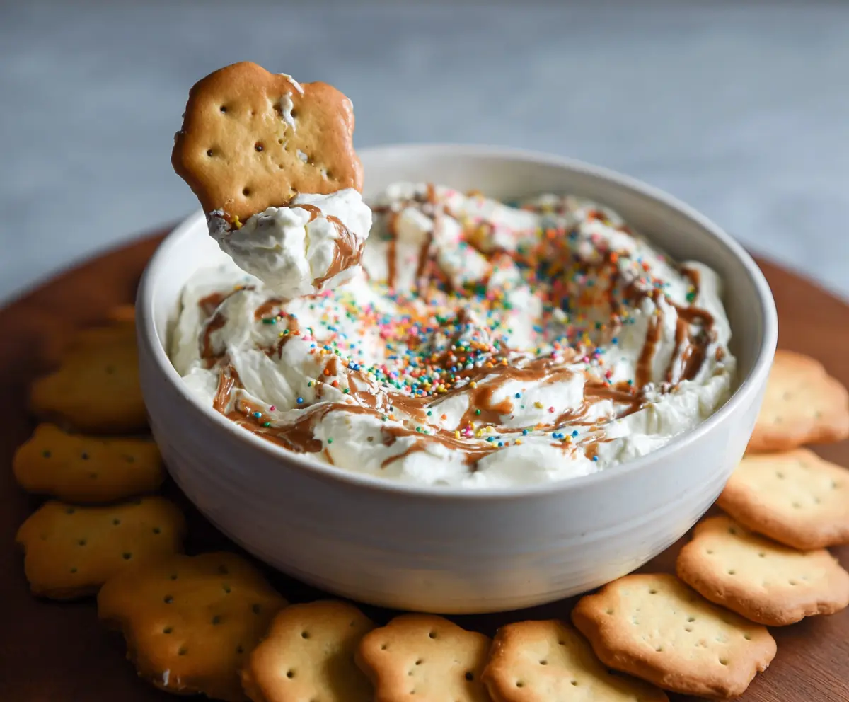 Transfer your delicious dip to a serving bowl. Top with the extra rainbow sprinkles for a pop of color. Serve it right away with your favorite crackers or pretzels—it’s ready to be enjoyed!