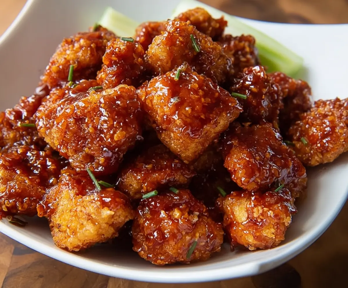 Transfer your honey BBQ popcorn chicken to a serving plate. If you like, sprinkle some sesame seeds on top for a nice touch. Serve immediately with celery sticks or your favorite dipping sauce for extra flavor.