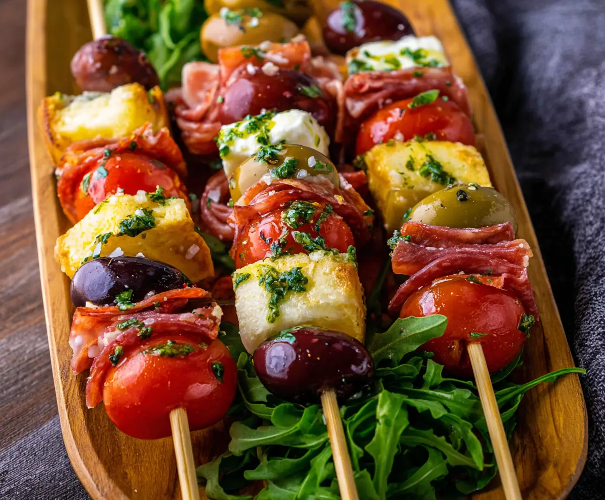 These vibrant skewers combine the classic Italian antipasto ingredients—salty olives and salami, creamy mozzarella, fragrant basil, and juicy tomatoes—perfectly balanced and easy to enjoy!