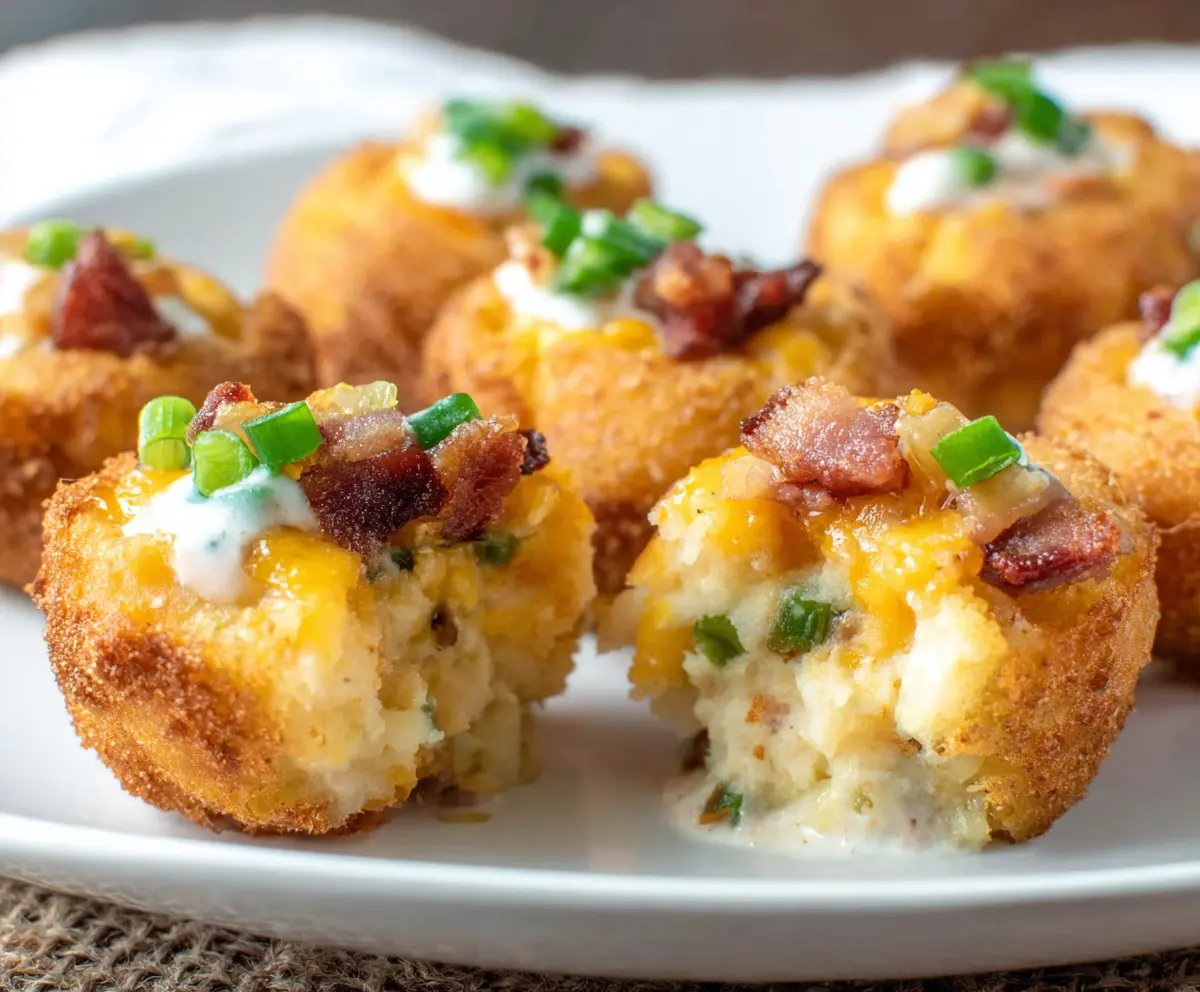 These Loaded Mashed Potato Bites are little pockets of joy! They are crispy on the outside and filled with creamy mashed potatoes mixed with cheese, bacon, and green onions.