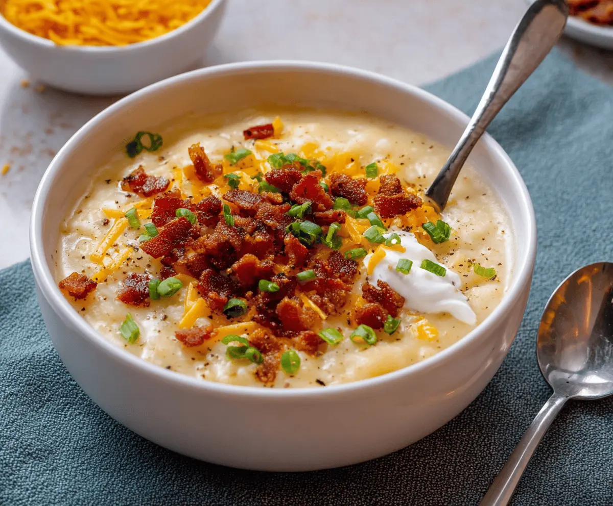 Serve the soup hot, topped with crumbled bacon, additional shredded cheddar cheese, and sliced green onions for a pop of color and flavor!