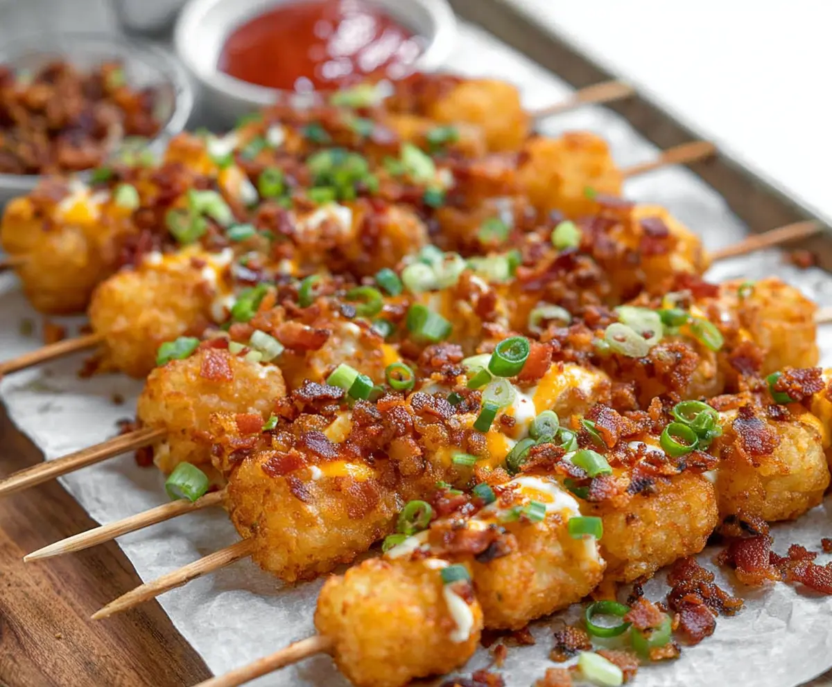 These loaded skewers combine crispy tater tots with gooey cheese, savory bacon, and fresh green onions—a perfect bite-sized indulgence!