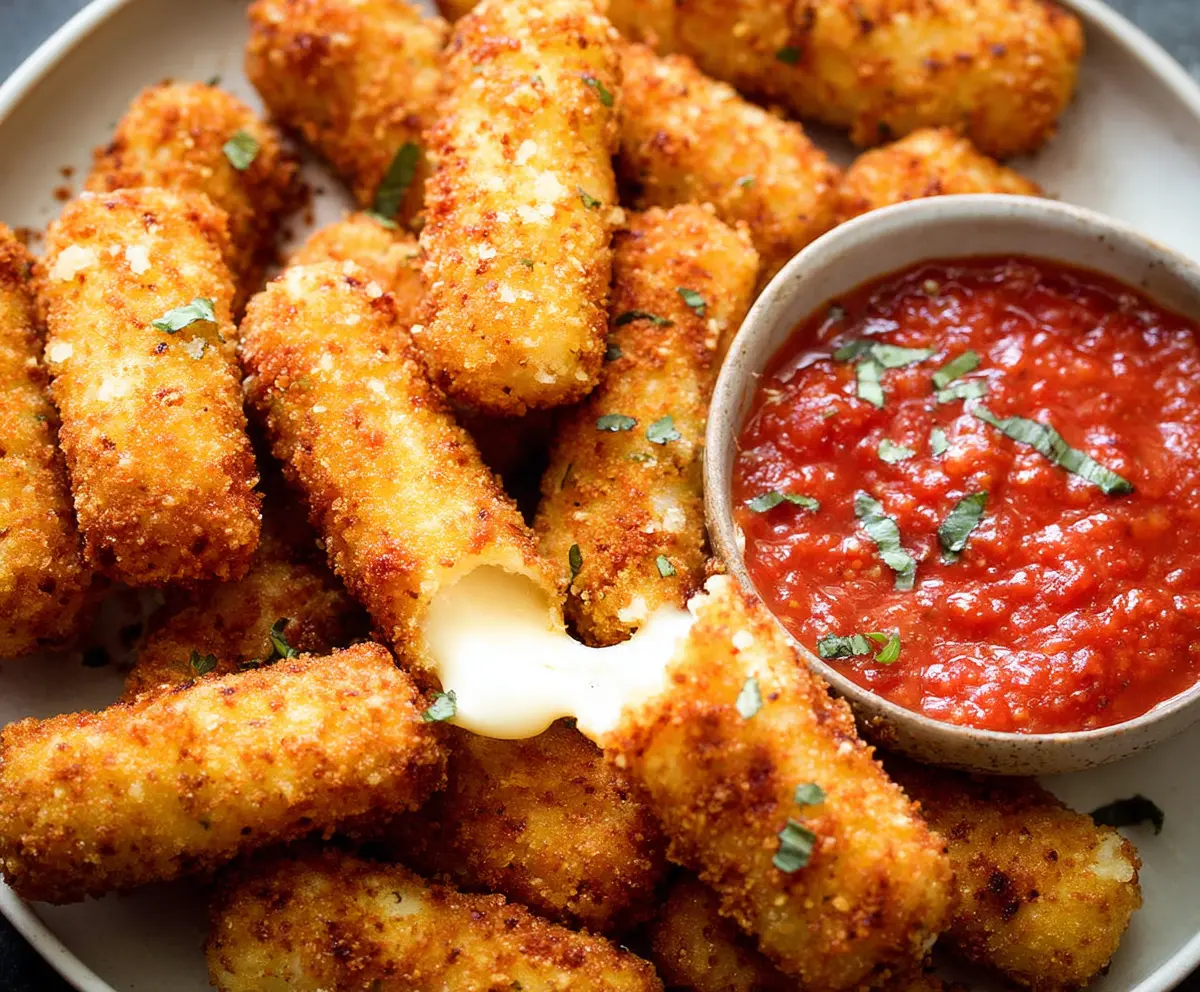 Serve your crispy mozzarella sticks warm with marinara sauce for dipping. Enjoy every cheesy, crunchy bite!