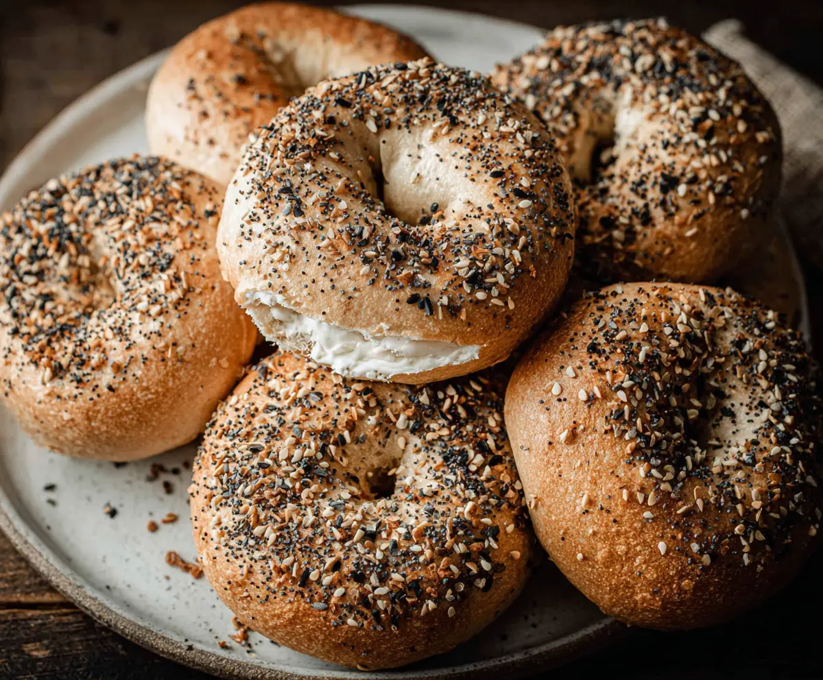 Enjoy your fresh and tangy overnight sourdough bagels topped with classic everything seasoning!