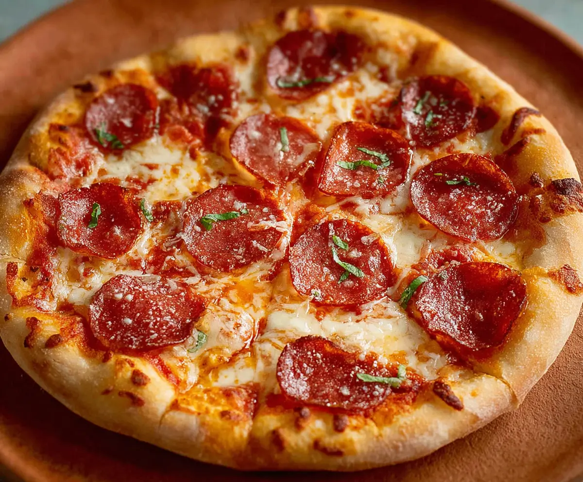 Optional: Before serving, sprinkle some crushed red pepper flakes on top if you like a bit of spice. Slice up your delicious homemade pepperoni pizza, serve it up, and enjoy every cheesy bite!