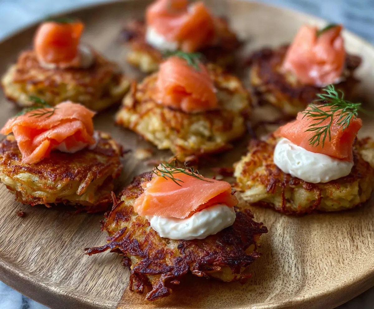 These potato latke bites are crispy on the outside and soft on the inside, topped with delicious smoked salmon. They’re perfect for a tasty snack or appetizer!