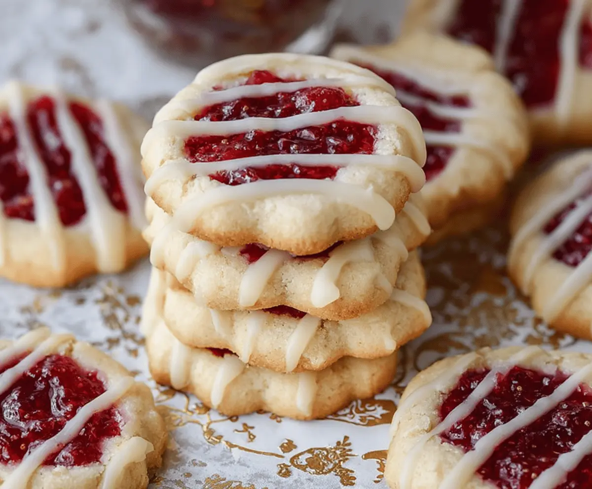 Let the glaze set for a few minutes before serving. Now, grab a cookie (or two!) and enjoy those buttery almond delights with their sweet raspberry filling!