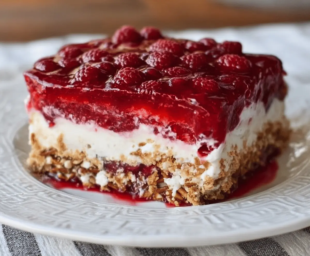Once your Raspberry Pretzel Salad Cake is set, it’s time to slice it into squares and serve chilled. Enjoy the delightful combination of the salty pretzel crust, creamy filling, and tart raspberry topping!