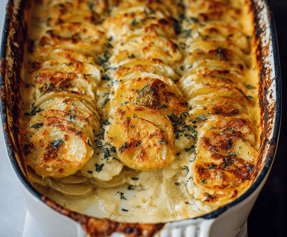 Once the scalloped potatoes are done baking, let them rest for about 10 minutes to thicken up. If you like, garnish with fresh thyme leaves for a pop of color and flavor.