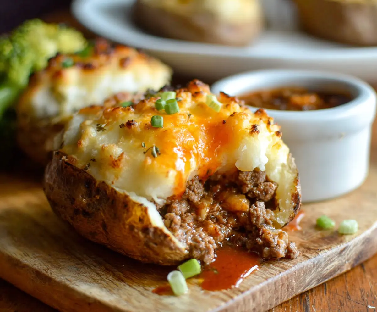 Generously fill each potato shell with the savory meat mixture. Level it off, then sprinkle a good amount of shredded cheese on top of each loaded potato.