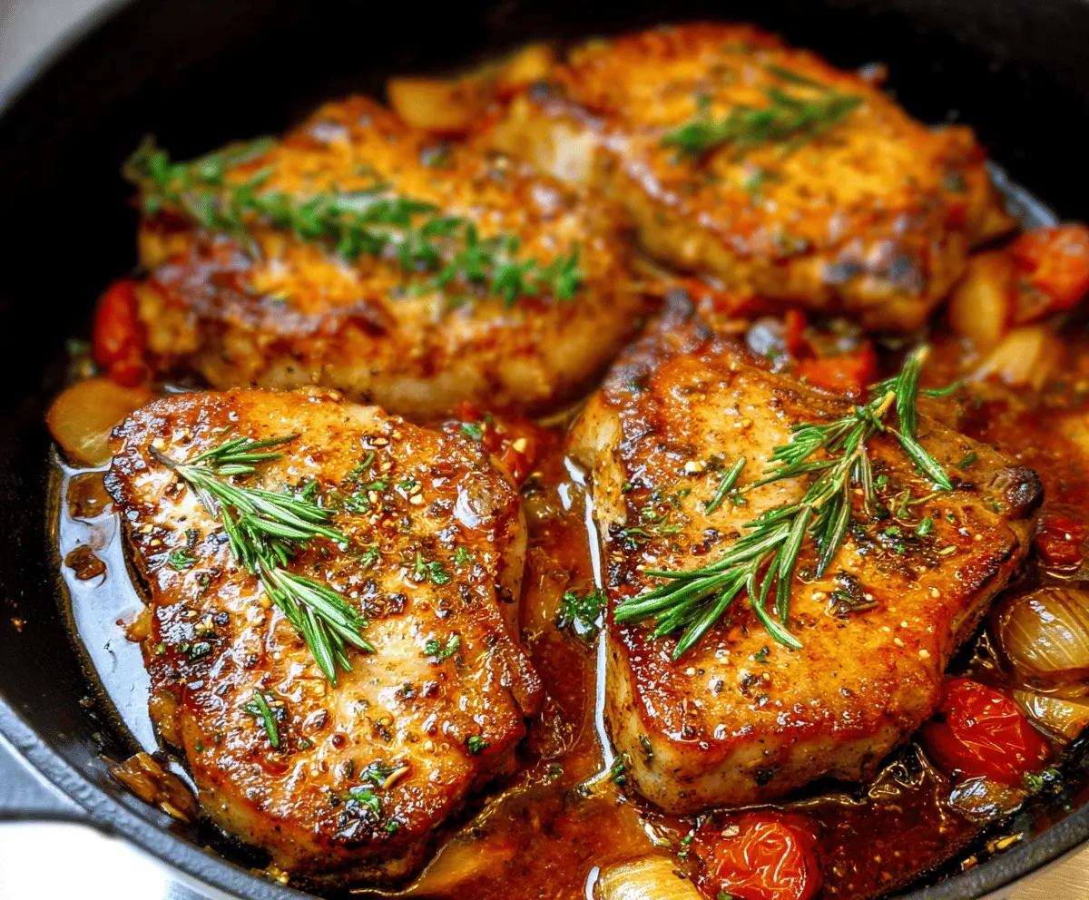 Remove the pork chops from the skillet and let them rest on a plate for about 5 minutes. This resting period is crucial as it allows the juices to redistribute, keeping your chops juicy. You can garnish them with the cooked herbs and tomatoes from the pan before serving.
