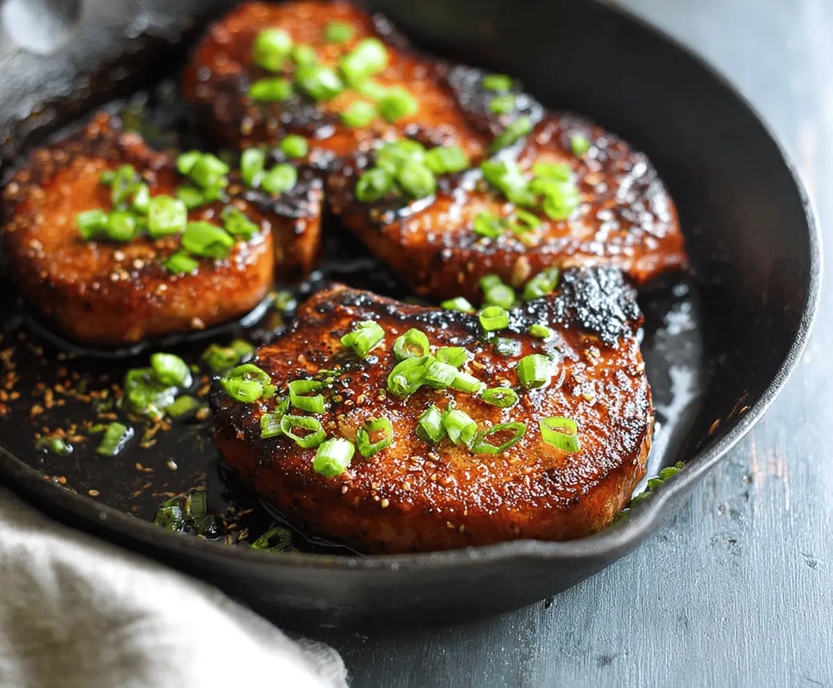 After cooking, remove the pork chops from the skillet and let them rest for a few minutes to keep them juicy. Garnish with sliced green onions and a sprinkle of toasted sesame seeds if desired.