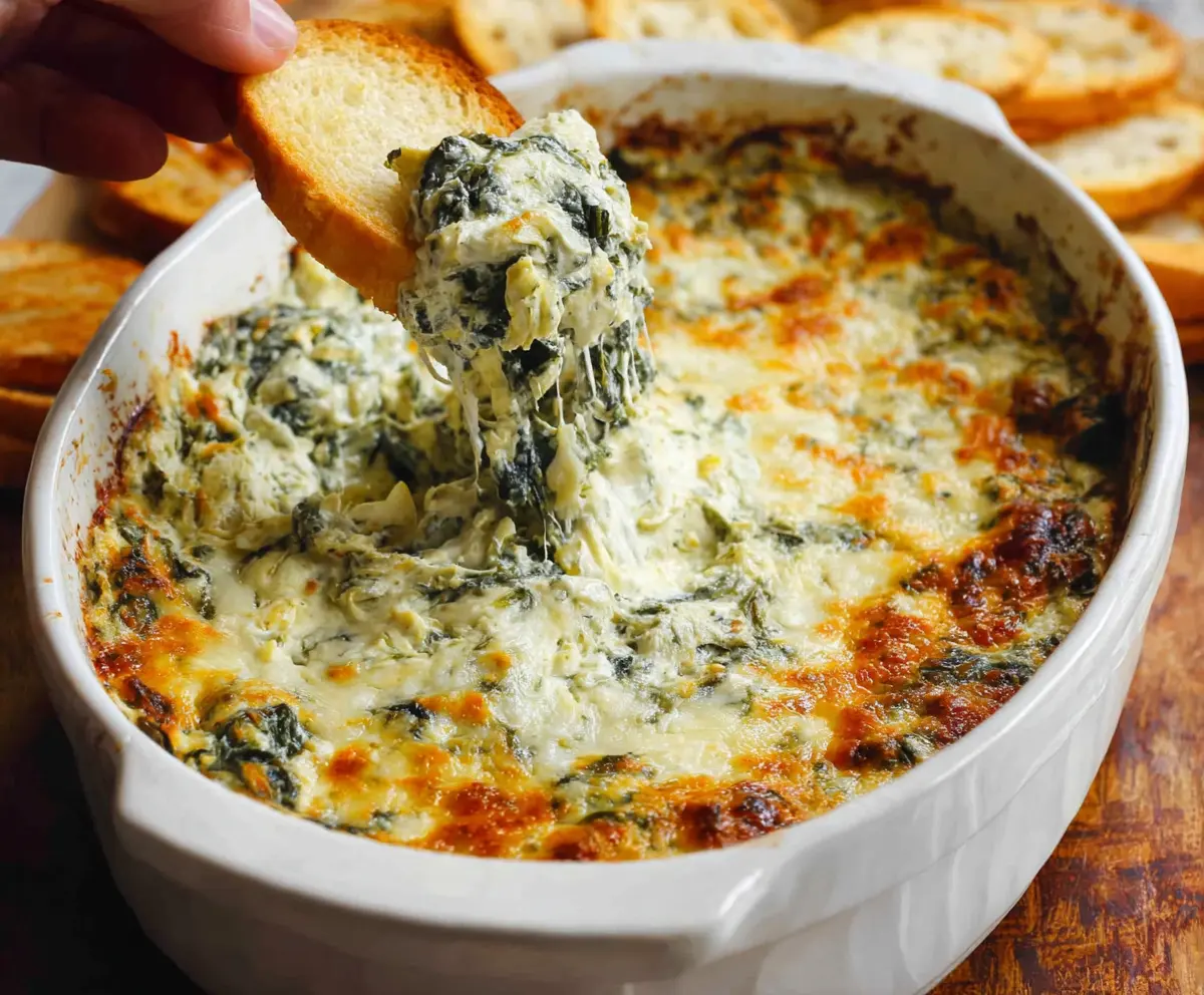 Serve your warm Spinach Artichoke Dip with toasted baguette slices, crunchy crackers, or fresh vegetable sticks for dipping. Enjoy the creamy, cheesy goodness!