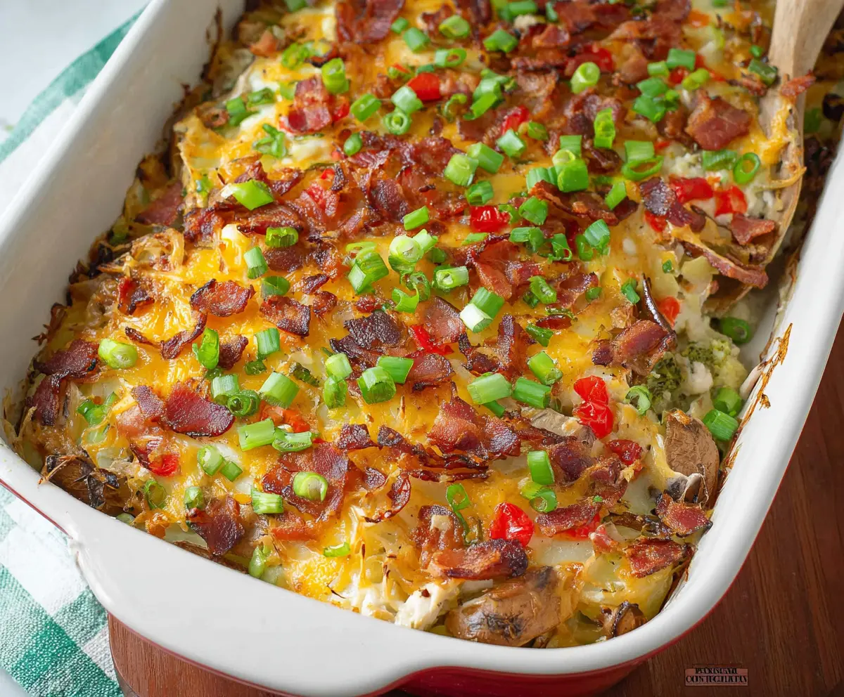 This hearty spring veggie-loaded chicken potato casserole combines tender potatoes and chicken with fresh broccoli, red pepper, crispy bacon, and melted cheddar, all topped with green onions for a colorful and flavorful finish. Enjoy!