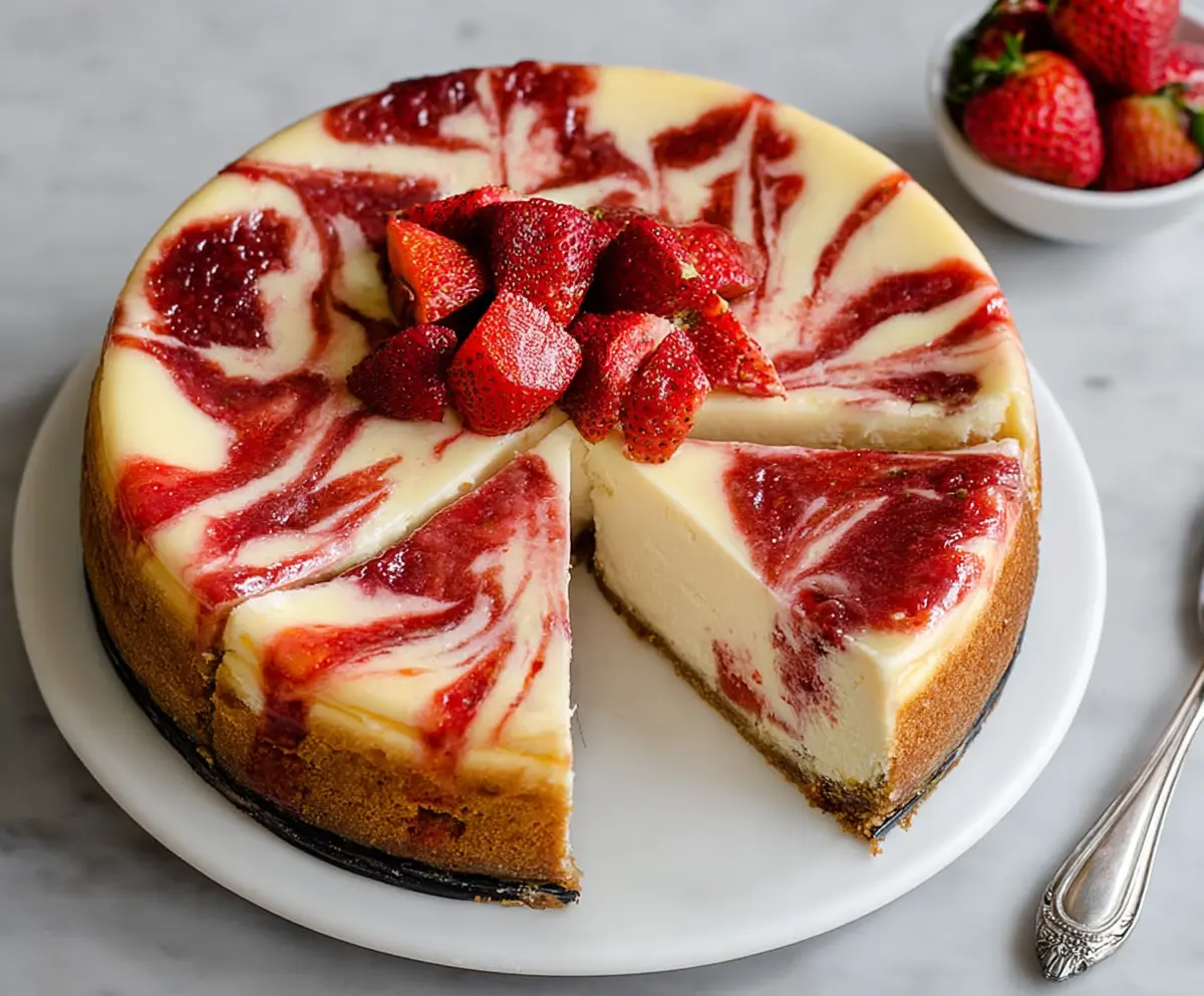 This delightful recipe yields a creamy cheesecake with a buttery graham cracker crust, topped with beautiful, flavorful strawberry swirls. Enjoy every bite!