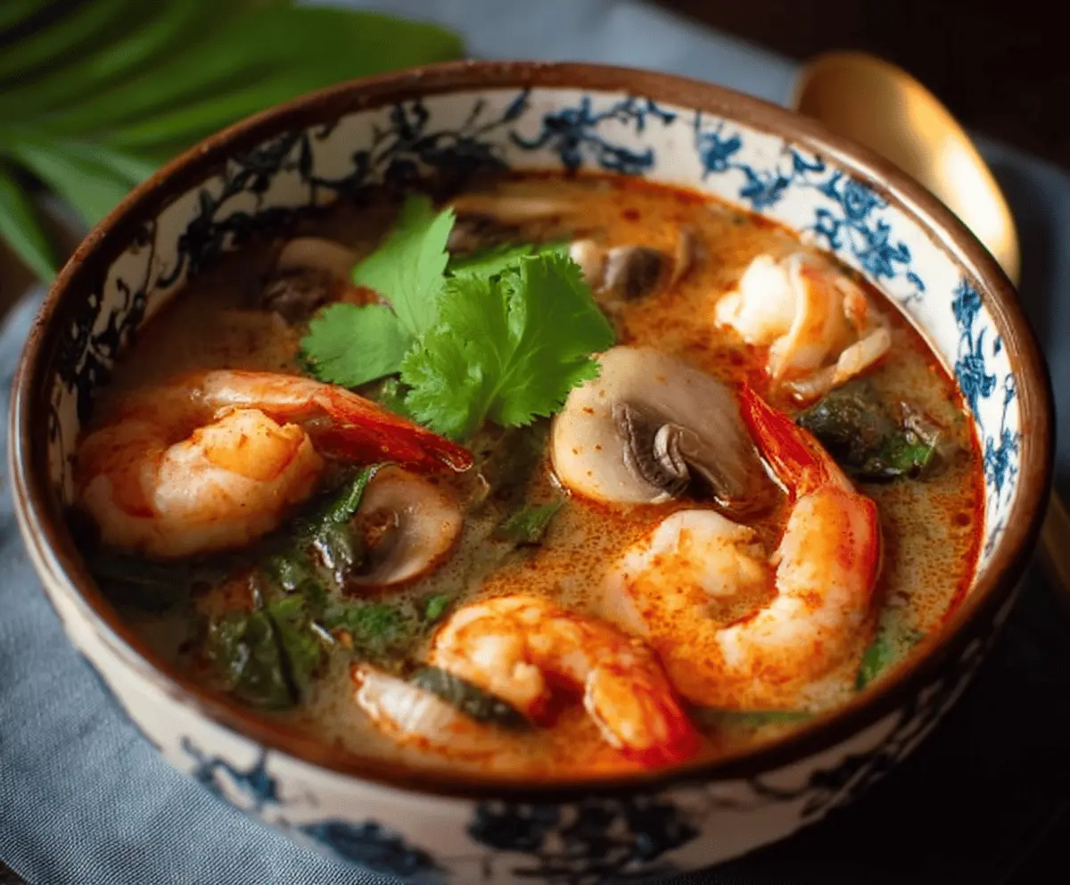 Tom Yum Soup is a hot and sour Thai dish that packs a flavorful punch! It’s made with shrimp, mushrooms, and fresh herbs like lemongrass and cilantro.