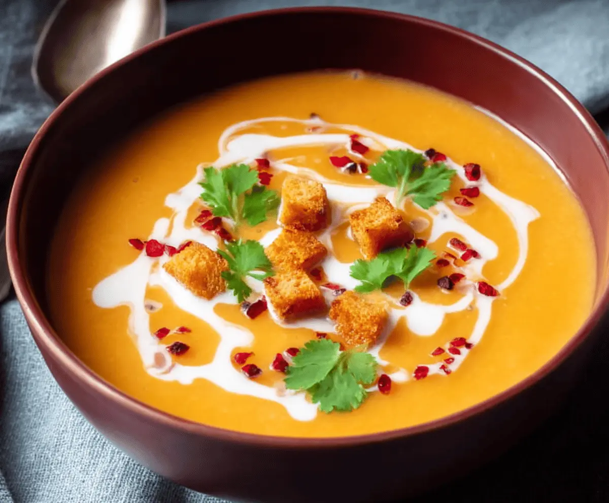 Pour your delicious soup into bowls and drizzle a bit of extra coconut milk on top. Add some vegan croutons or crusty bread cubes, sprinkle fresh cilantro leaves, and if you like a bit of heat, add some dried chili flakes.