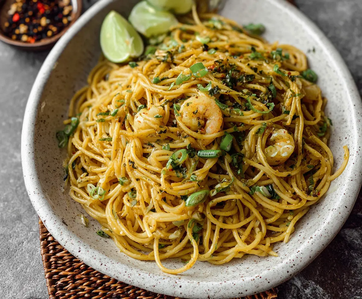Return the cooked shrimp to the skillet and mix gently with the noodles. Finally, toss in the sliced green onions and give it another gentle toss.