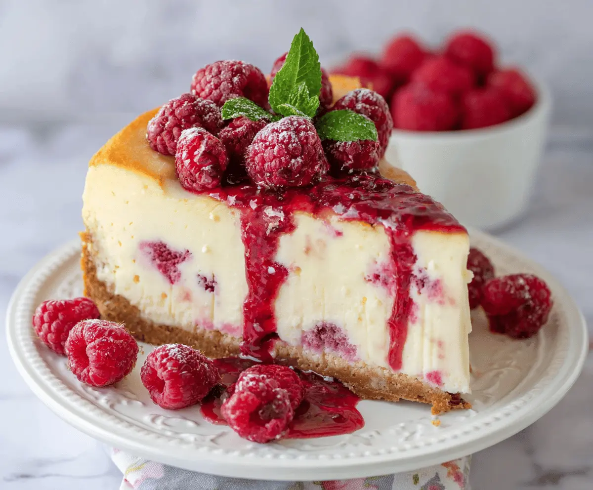 This cheesecake is a delightful combination of a buttery crust, silky white chocolate filling, and sweet-tart raspberry swirls, making each bite a little bit of heaven. Enjoy!